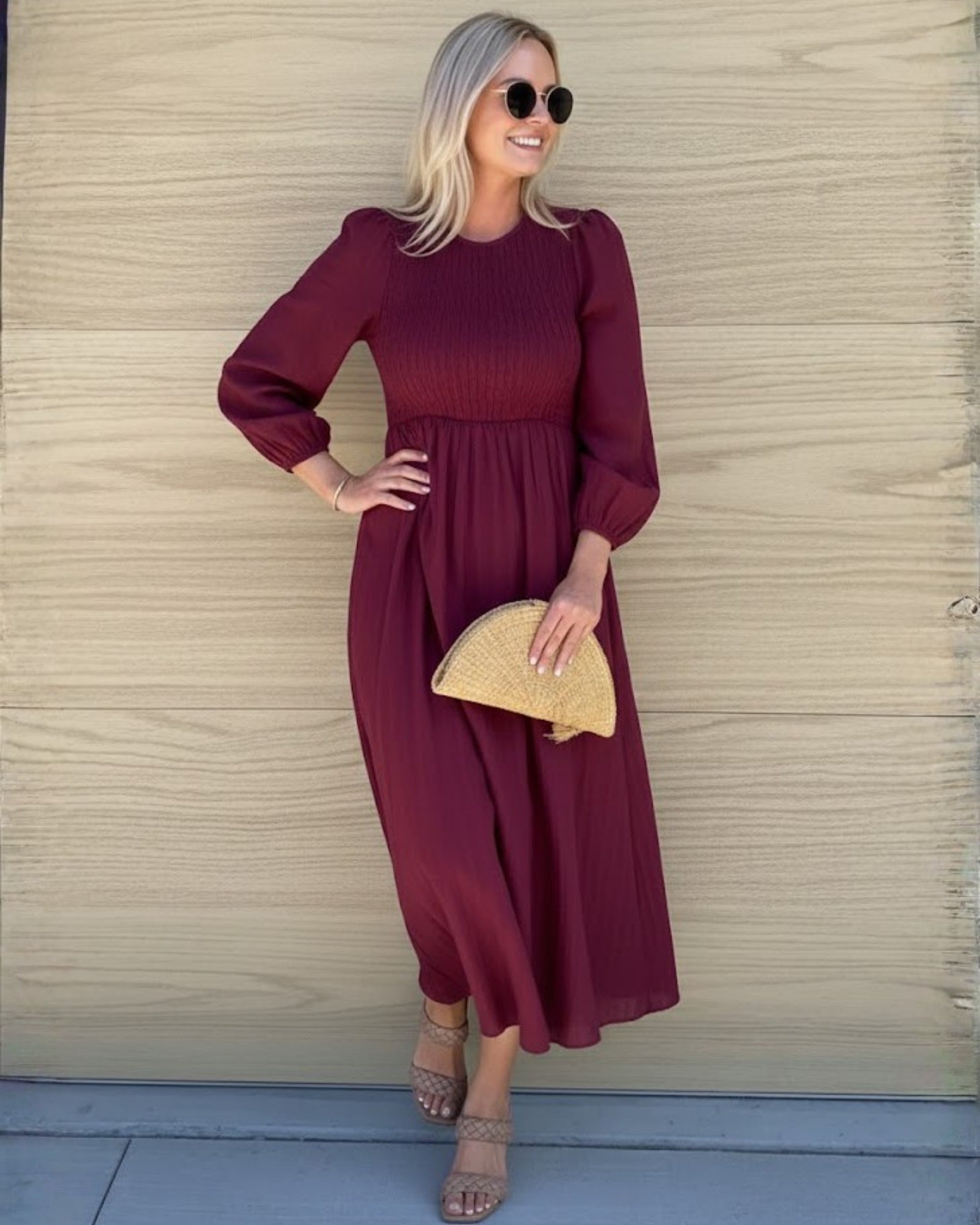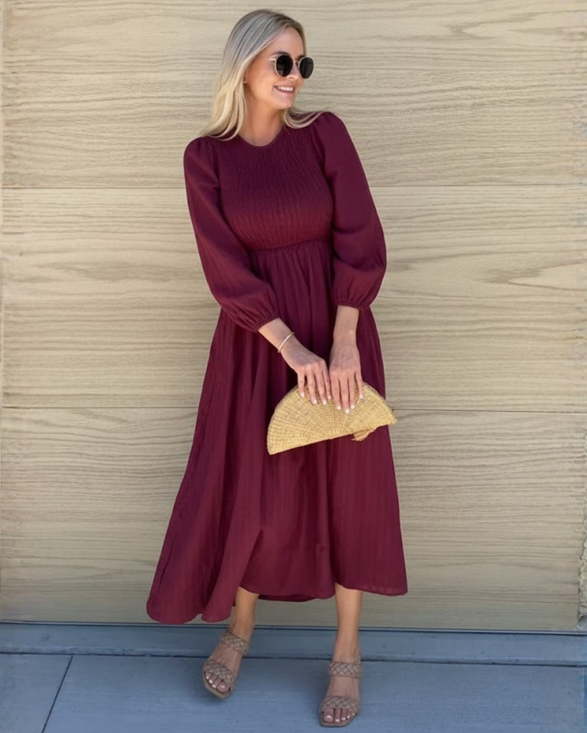 The Iolana is distinguished by its beautifully shirred bodice that creates a tailored look while offering maximum comfort. The deep wine hue provides a sophisticated depth that transitions perfectly from golden hour to moonlight.