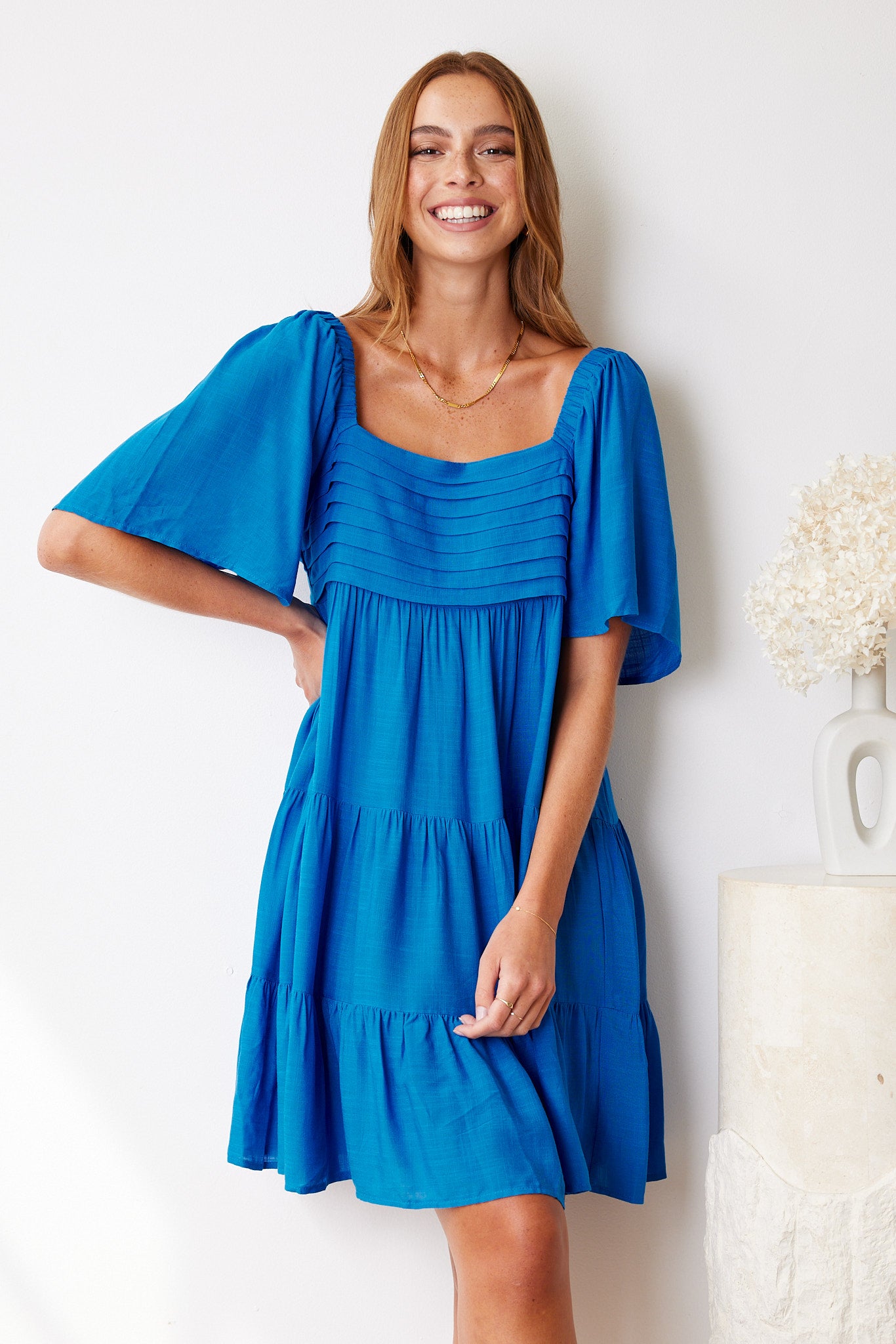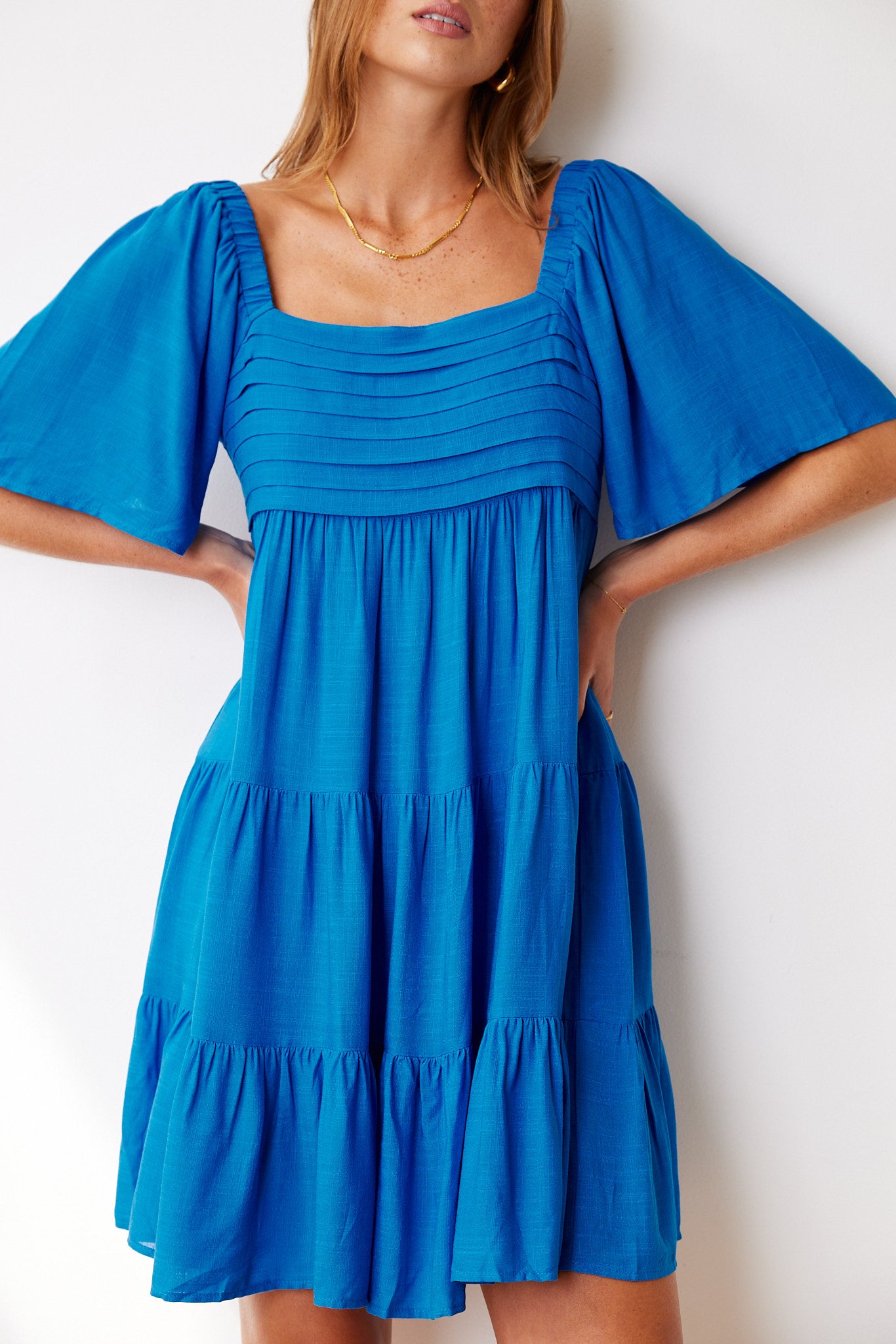 Our Jody Dress comes in a blue colour. A harmonious display of gracefulness and loveliness, this mini is designed with a square neckline, short sleeves, gathered bust and flowy a-line skirt. Style with a pair of hoop earrings and lace up sandals!