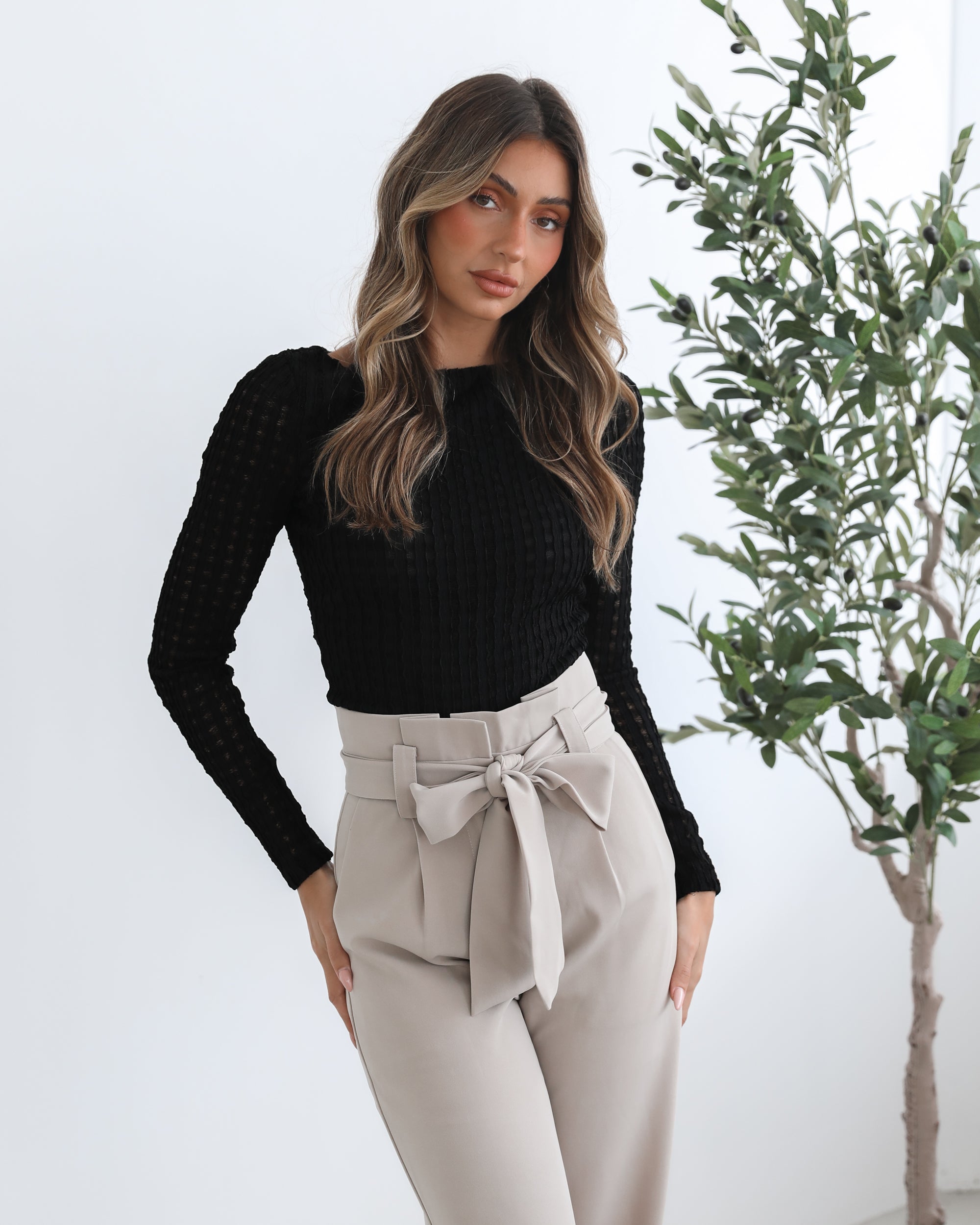 Our Leslie Top comes in a black colour. This season's new hero features a boat neckline, long sleeves and tight fit. Layer it under a blazer or let it shine solo!