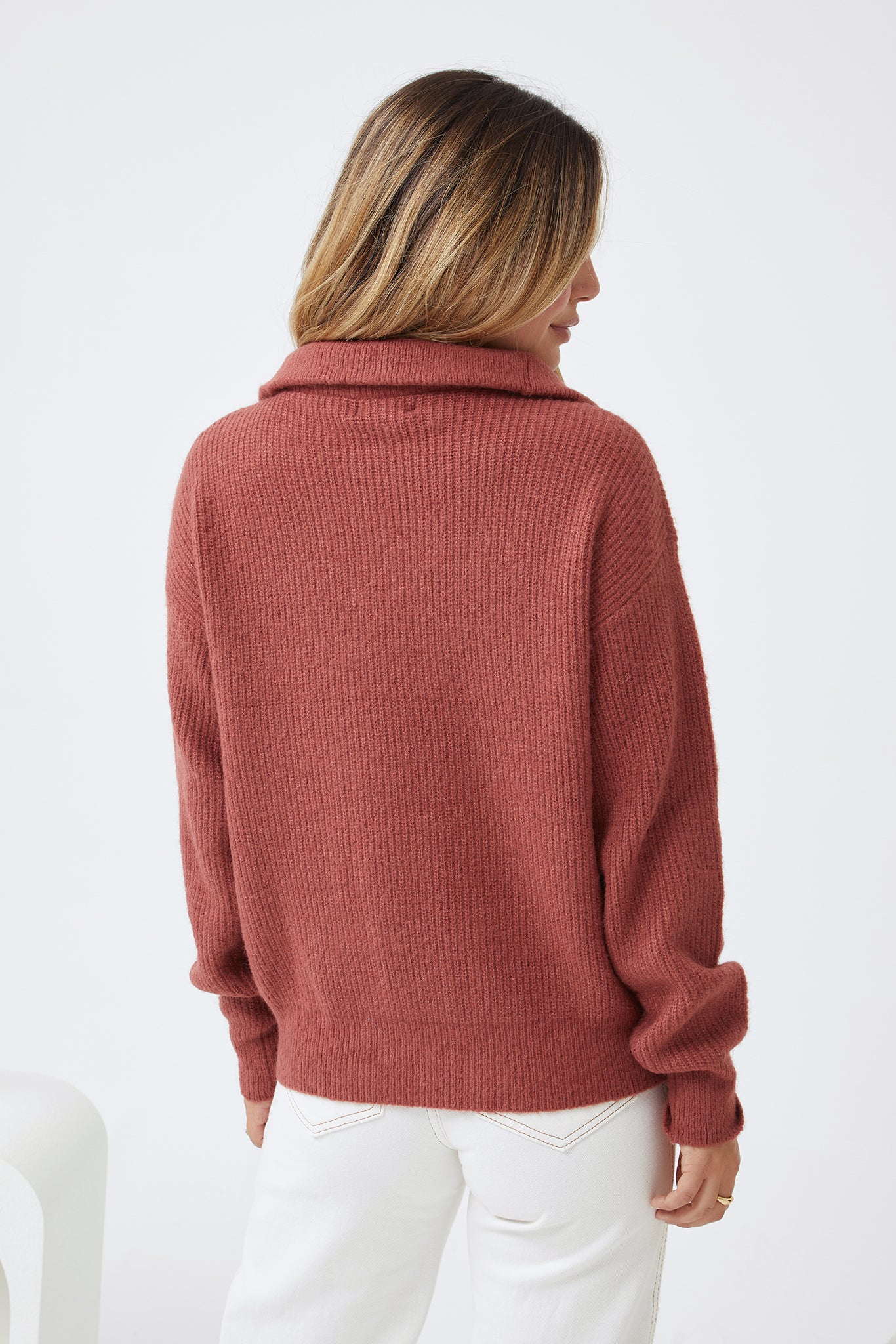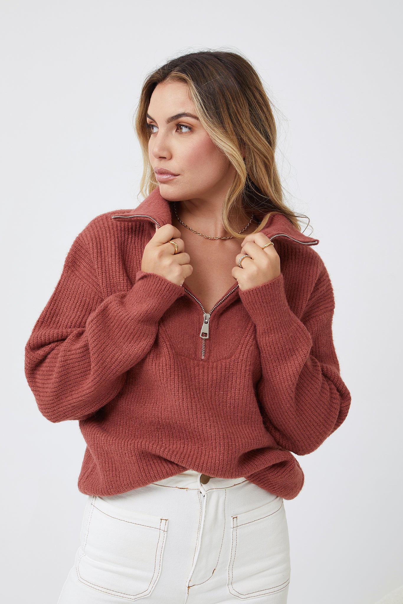 Our Merete Knit comes in a lovely brick colour. It features a high collar that comes together with a zipper, long relaxed sleeves and a contrasting rib knit pattern all over the garment. This relaxed knit is perfect for layering during the colder months ahead!