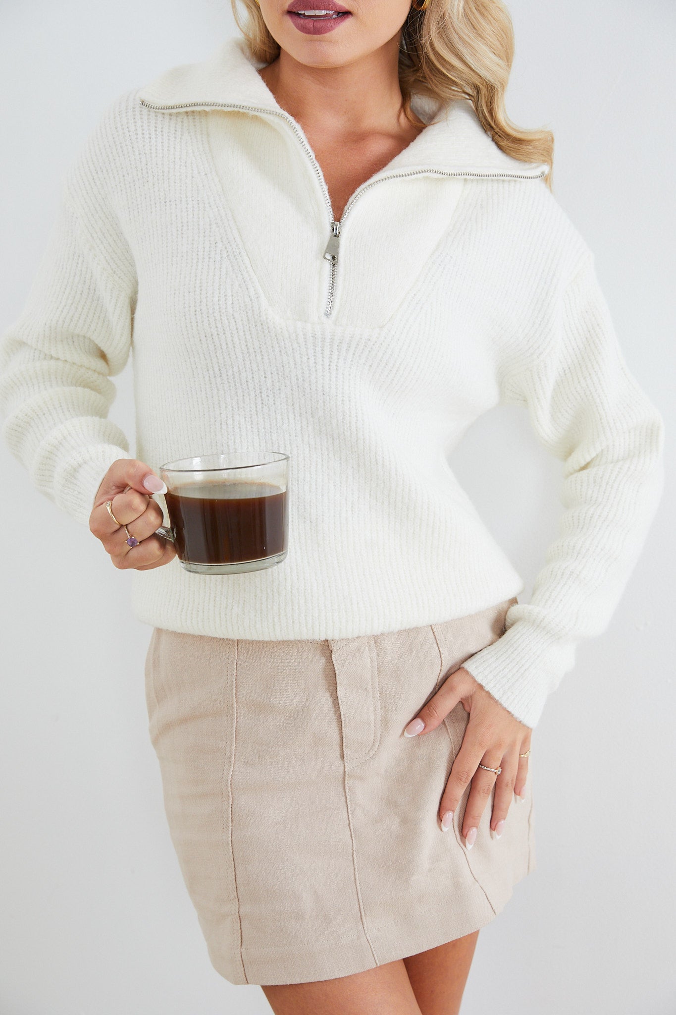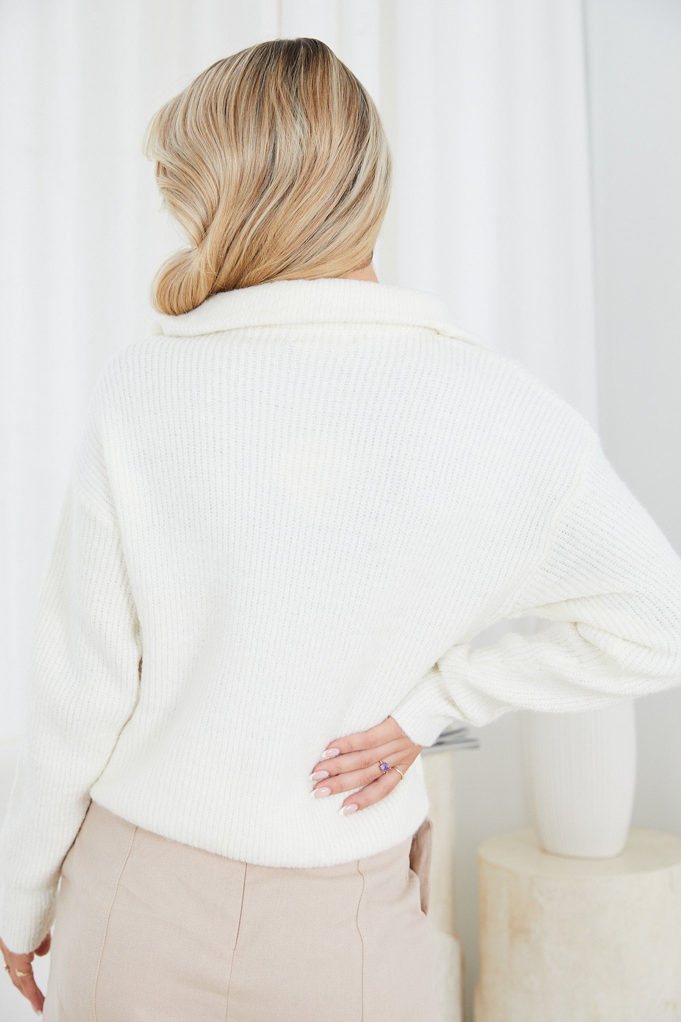 Our Merete Knit comes in a crisp white colour. It features a high collar that comes together with a zipper, long relaxed sleeves and a contrasting rib knit pattern all over the garment. This relaxed knit is perfect for layering during the colder months ahead!