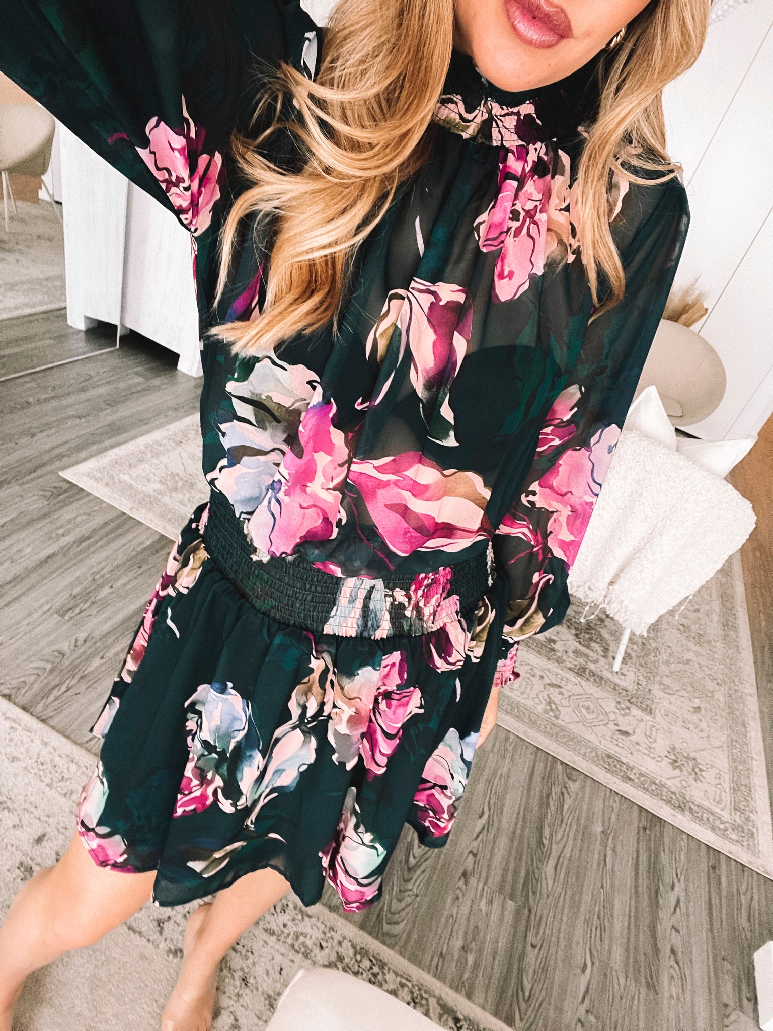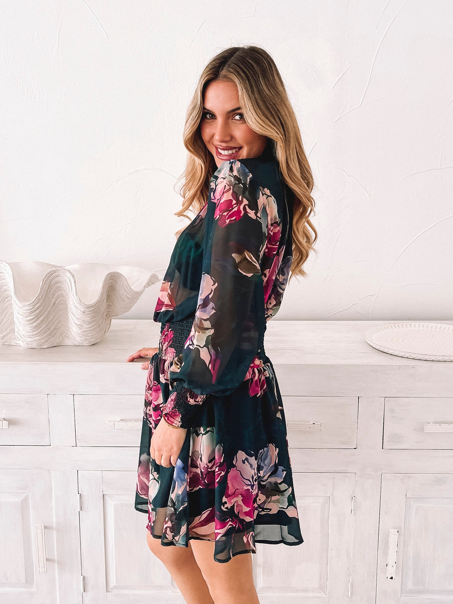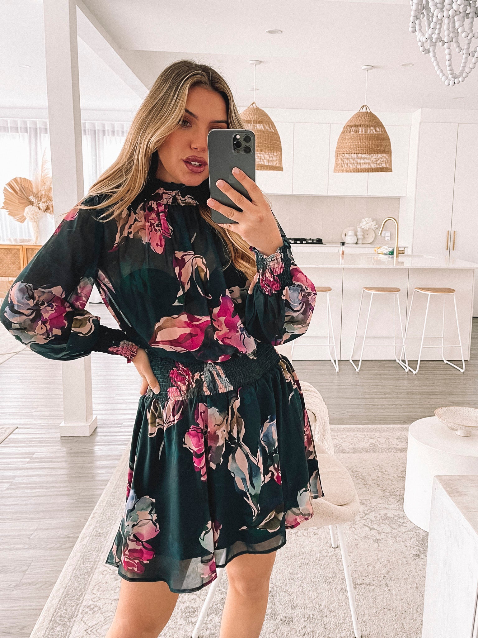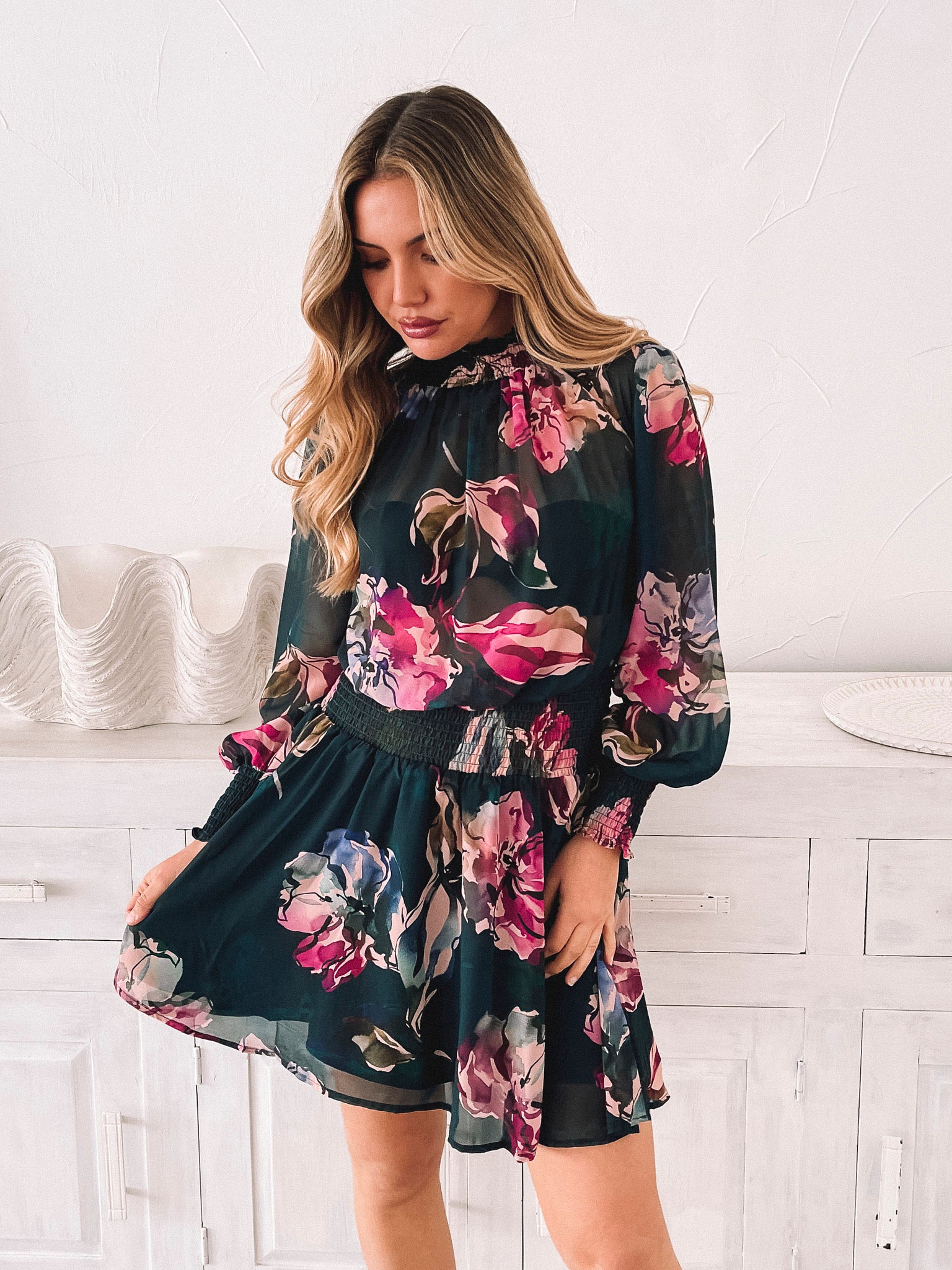 Our Neary Dress comes in an emerald floral print. Indulge in an ultimate fashion experience with this number that features a high neckline, long sleeves with smocking on cuffs, gathered detailing and mini length. Look extra stylish with platform heels and diamond accessories!