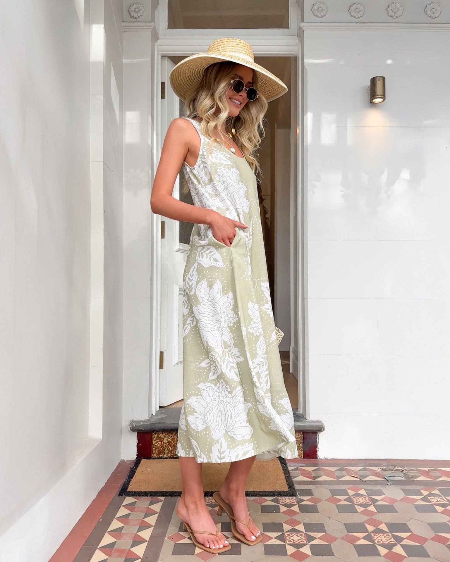 Our Noerele Dress comes in a light khaki base with white prints. Crafted in a dreamy shade and delicate patterns, this piece is designed with a wide round neckline, relaxed silhouette and maxi length hem. Pair with nude sandals, a floppy hat, and a dainty bracelet stack for a look that’s effortlessly chic.