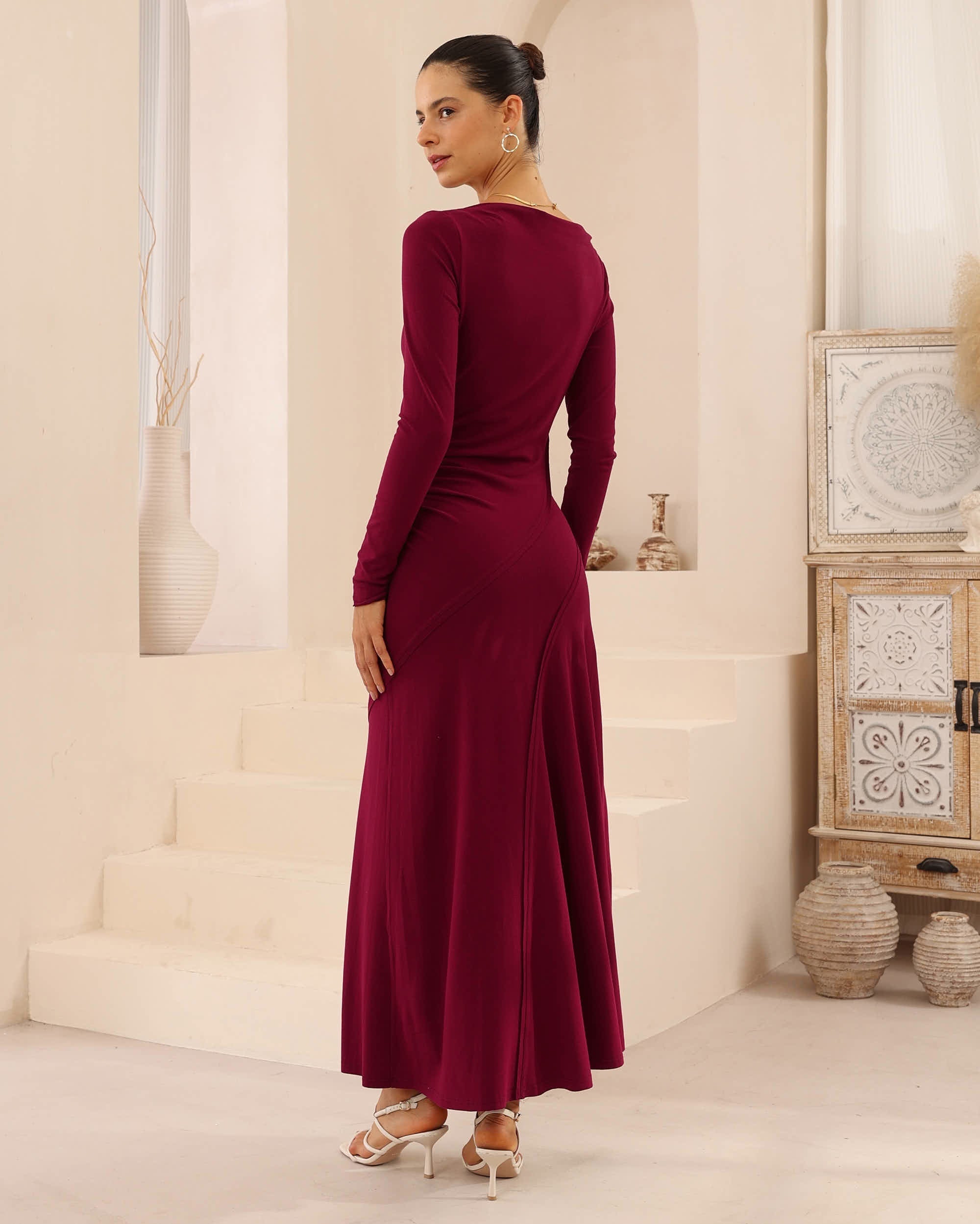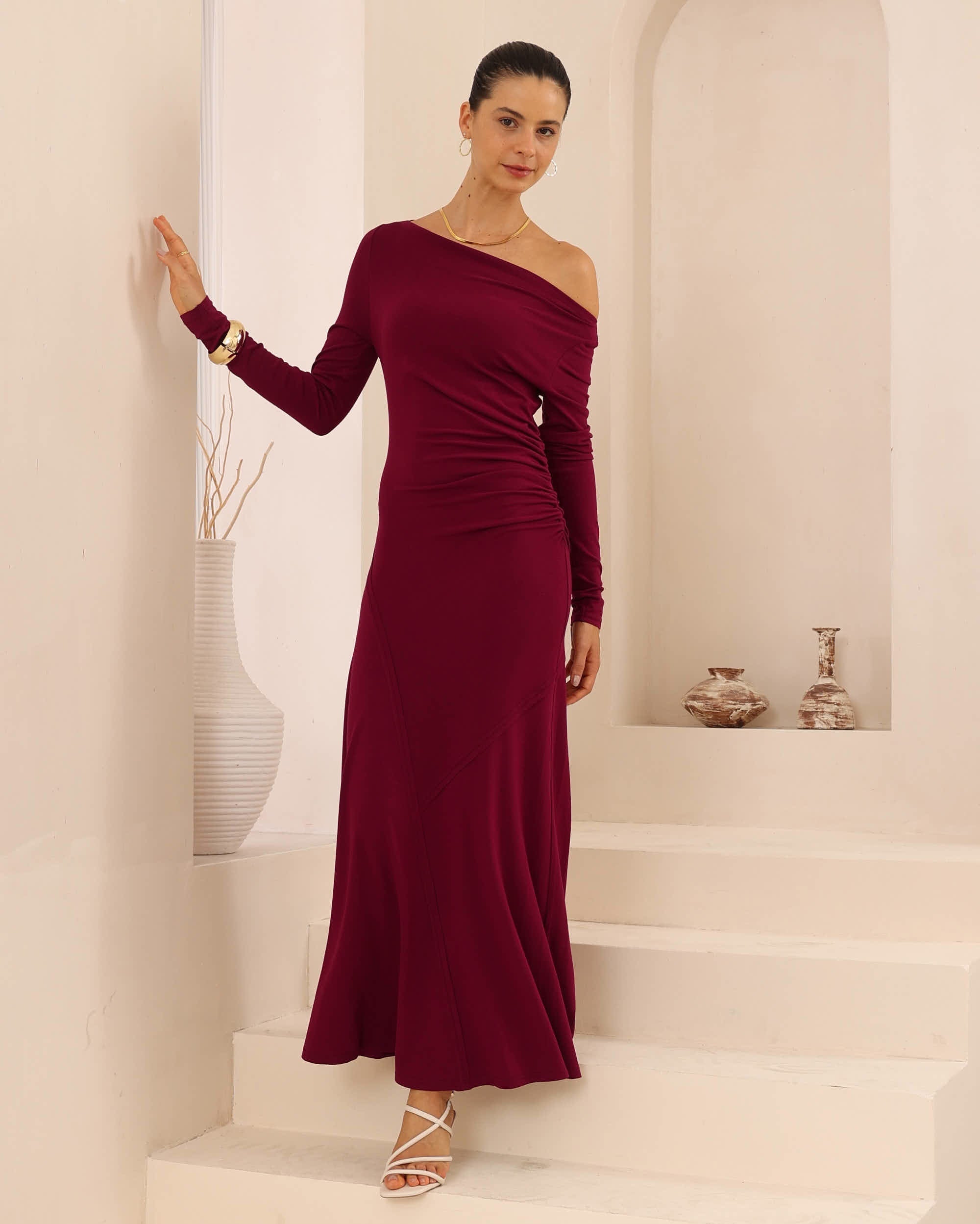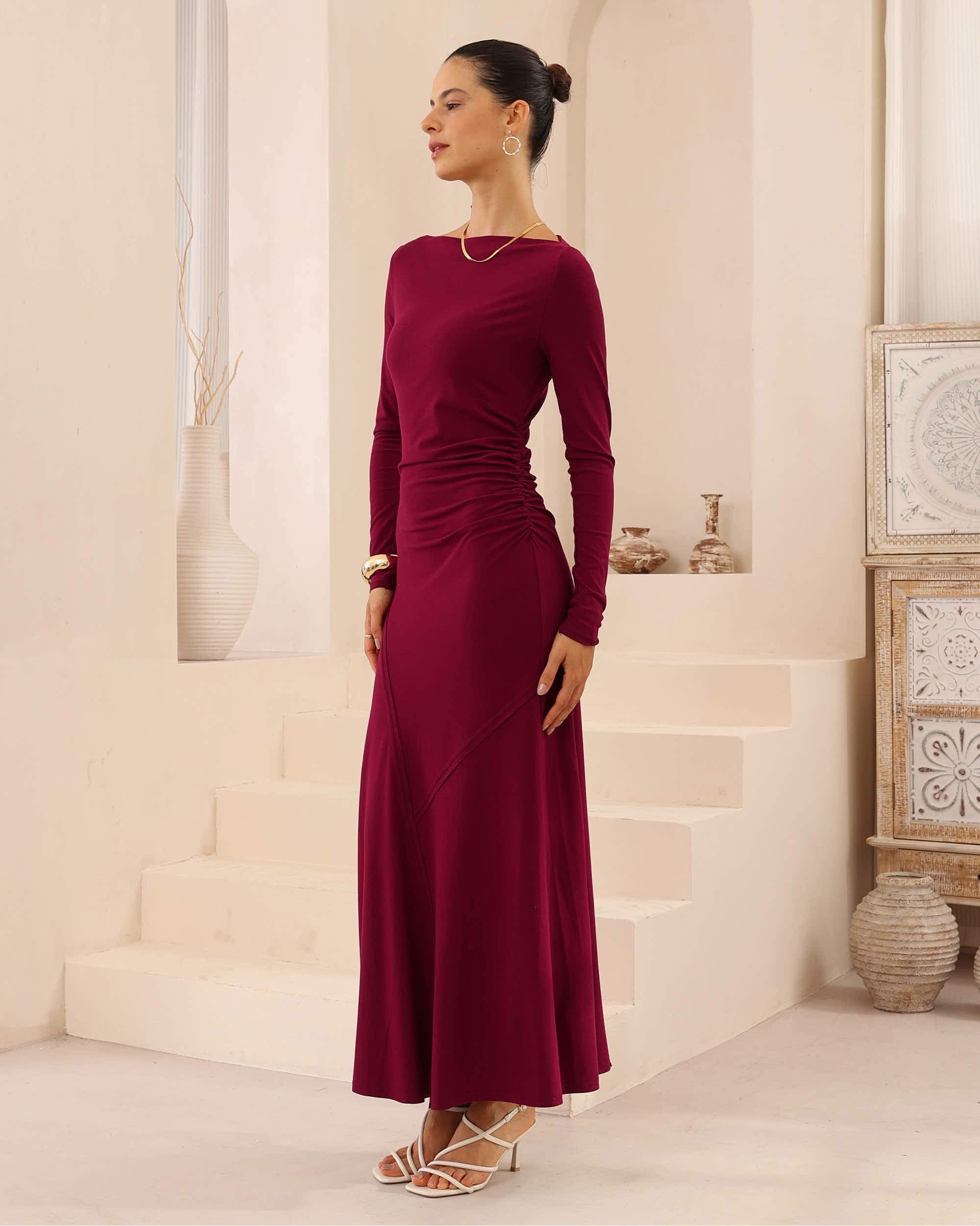 • Key Features: Boat neckline. Long tight sleeves. Ruching on waist. Flowy skirt. Maxi length hem.