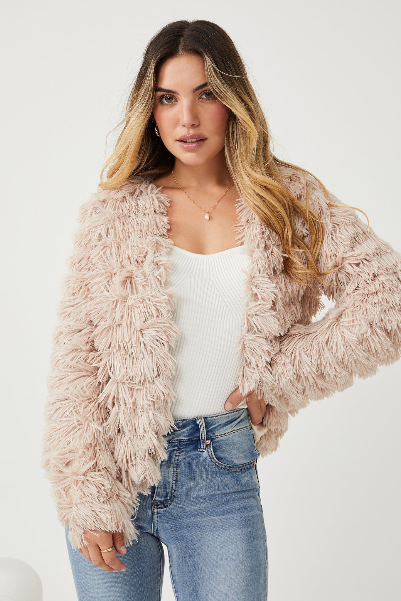 Our Ophelle Jacket comes in a mellow beige colour. Discovering a fabulous and stylish state of mind in this long sleeve fluffy jacket that does its work in both style and function departments. It features an open front to show off your statement inner top!