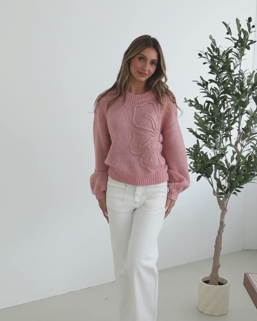 Our Ophira Knit comes in a pink colour. A touch of vintage romance to your everyday style, this top is designed with a round neckline, long sleeves, floral embroidery on the side and relaxed fit. Pair it with high-waisted denim and loafers for casual sophistication!
