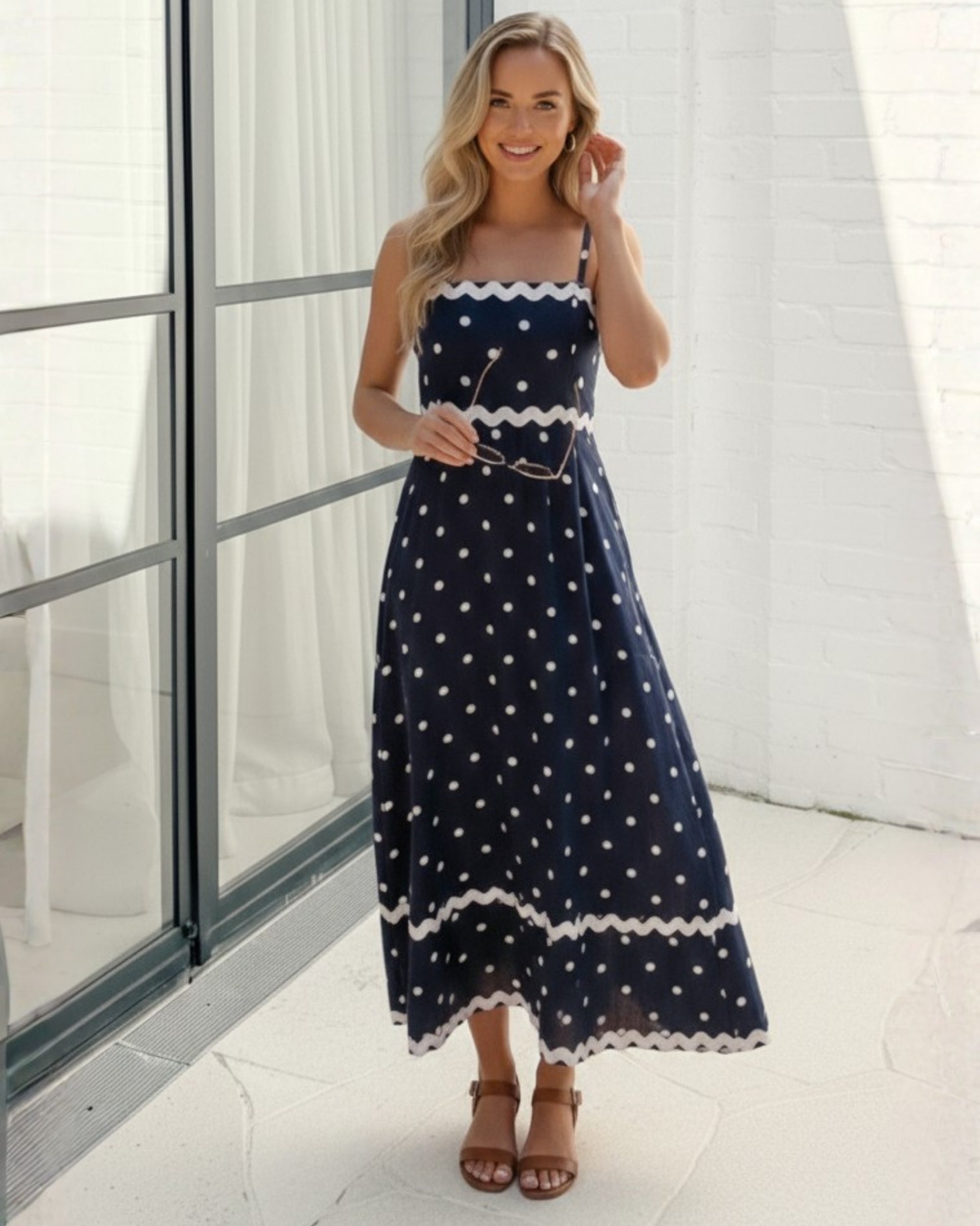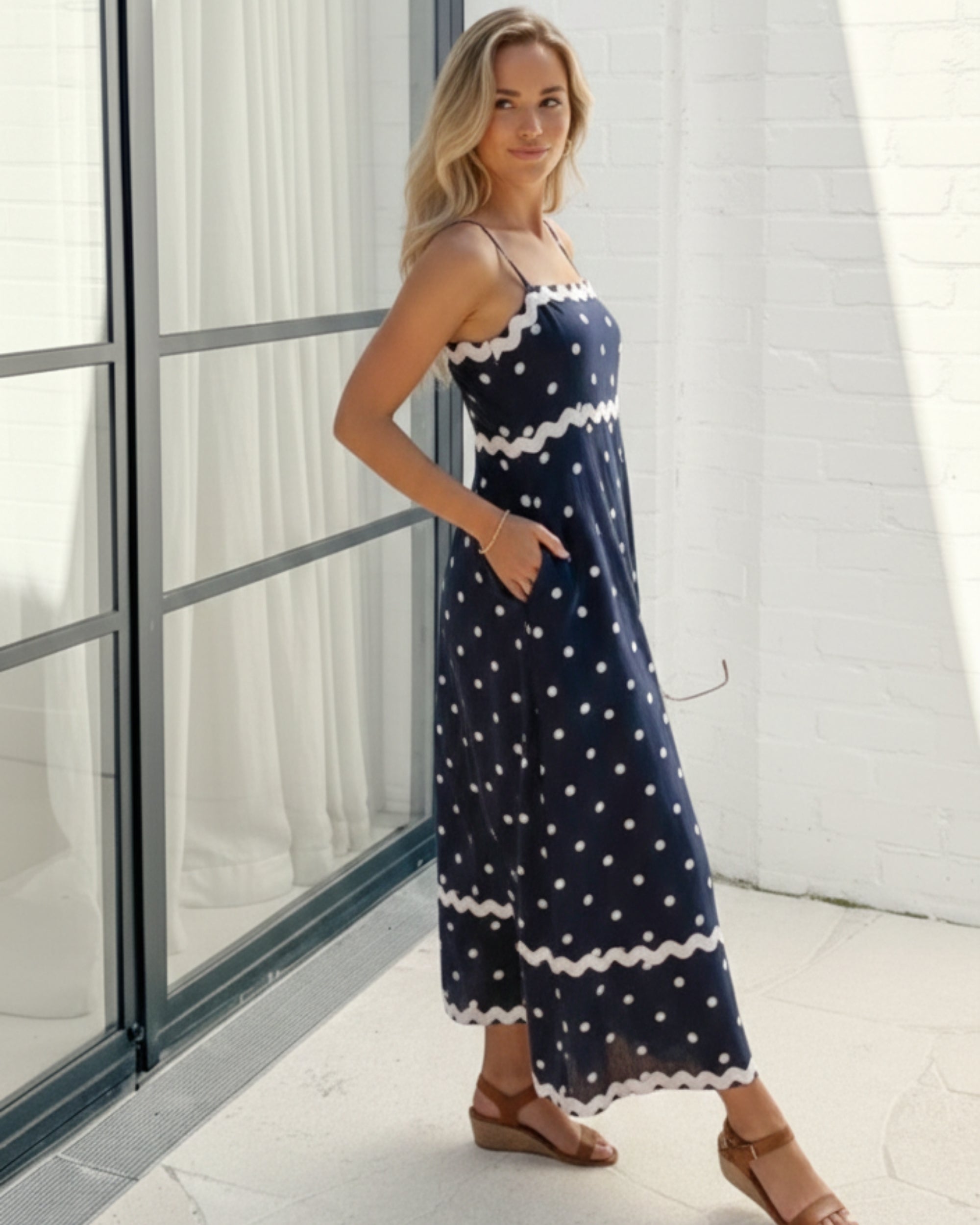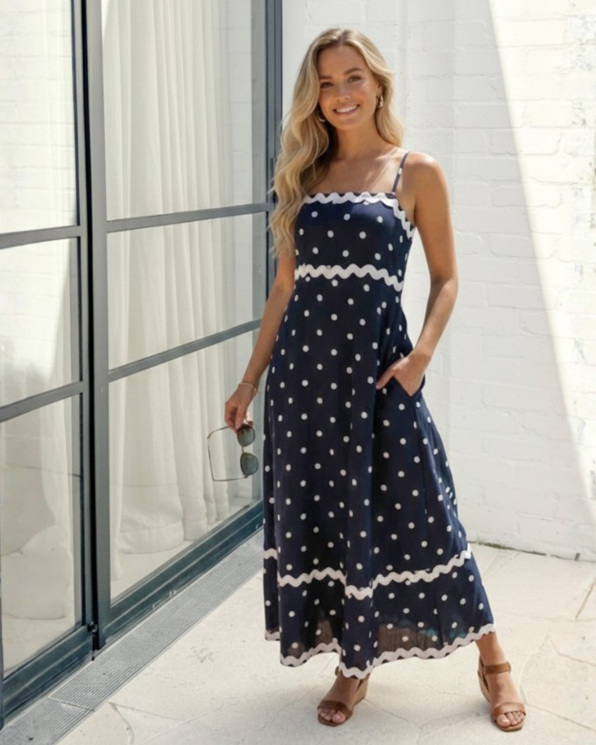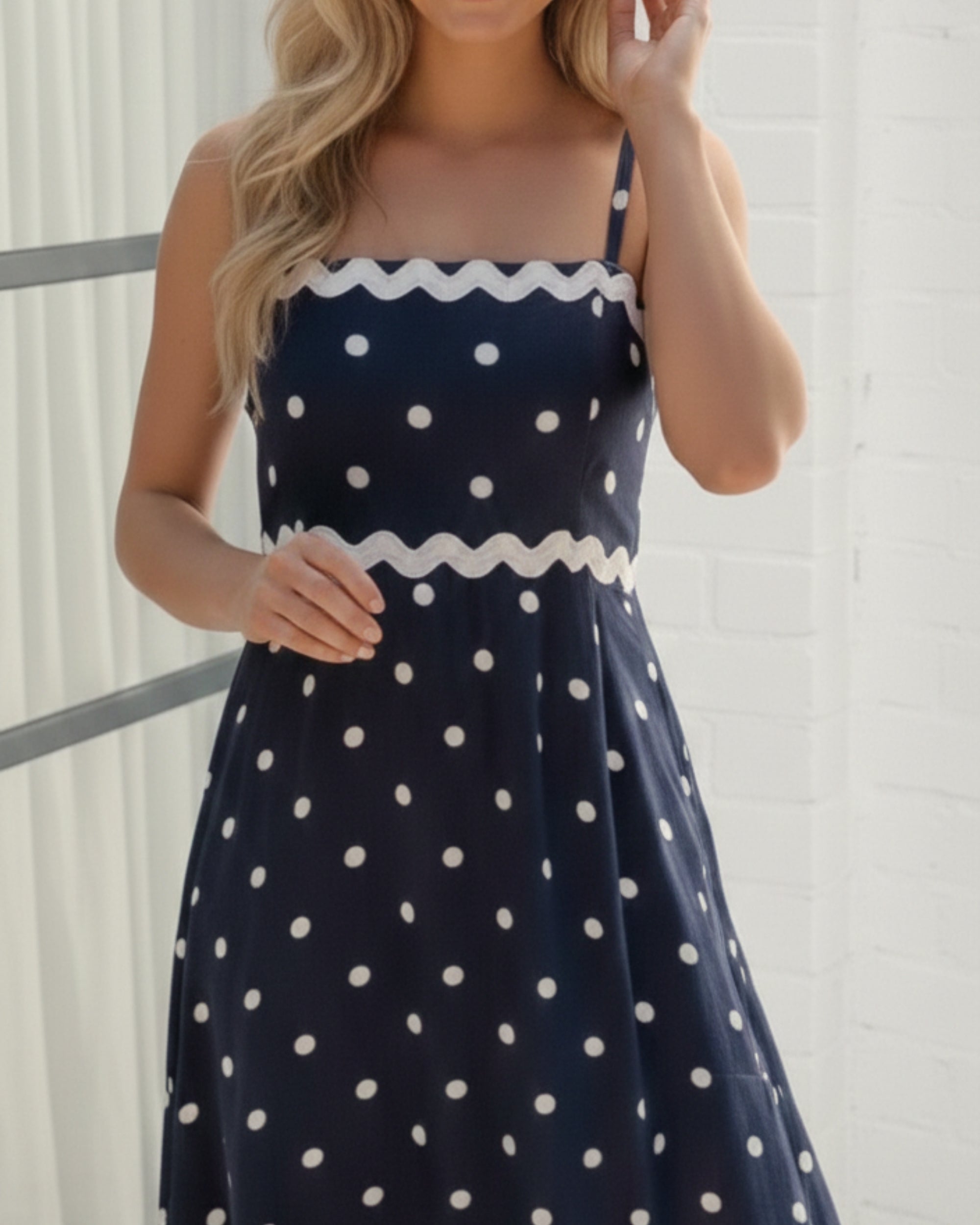 • Features a sophisticated navy base adorned with crisp white polka dots, offering a playful yet refined aesthetic. The unique scalloped white trim detailing across the bodice and hem adds a touch of whimsical elegance, setting this dress apart from your standard midi. Flattering A-line fit that flows beautifully with every step. Elegant square neckline supported by delicate spaghetti straps. Designed with discreet side pockets for ultimate convenience. Lightweight, breathable material perfect for warm-weather styling.