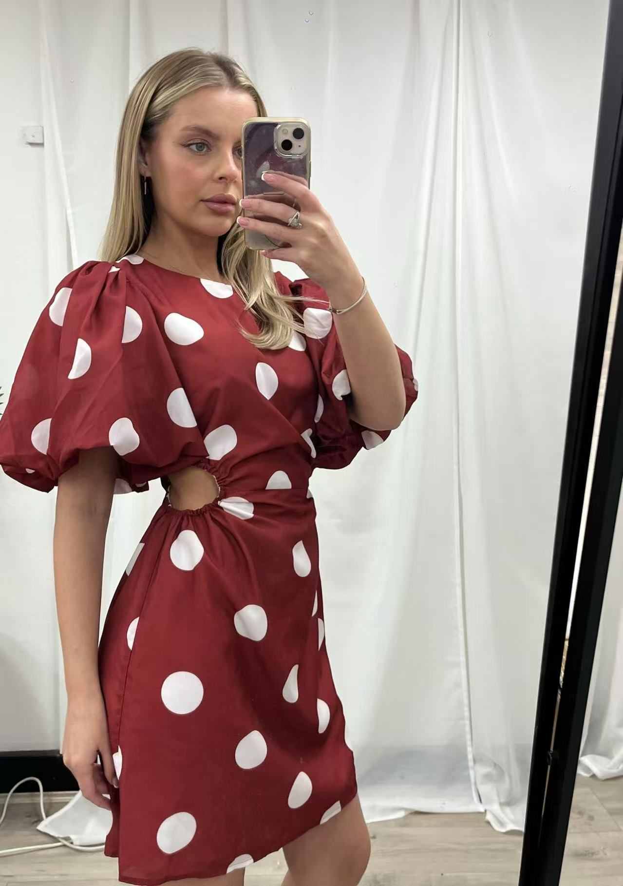 Our Shahnaz Dress - Wine Spot comes in elegant wine and white tones, blending vintage charm with modern flair. Featuring bold puff sleeves and classic white polka dots, this mini dress offers a playful yet feminine silhouette. Style it with strappy heels or ankle boots and a structured handbag for an effortlessly chic look!