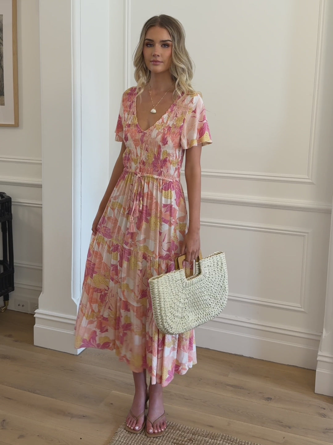 • Key Features: V-neckline. Short flutter sleeves. Smocked bodice. Waist tie. Flowy tiered skirt. Midaxi length hem.