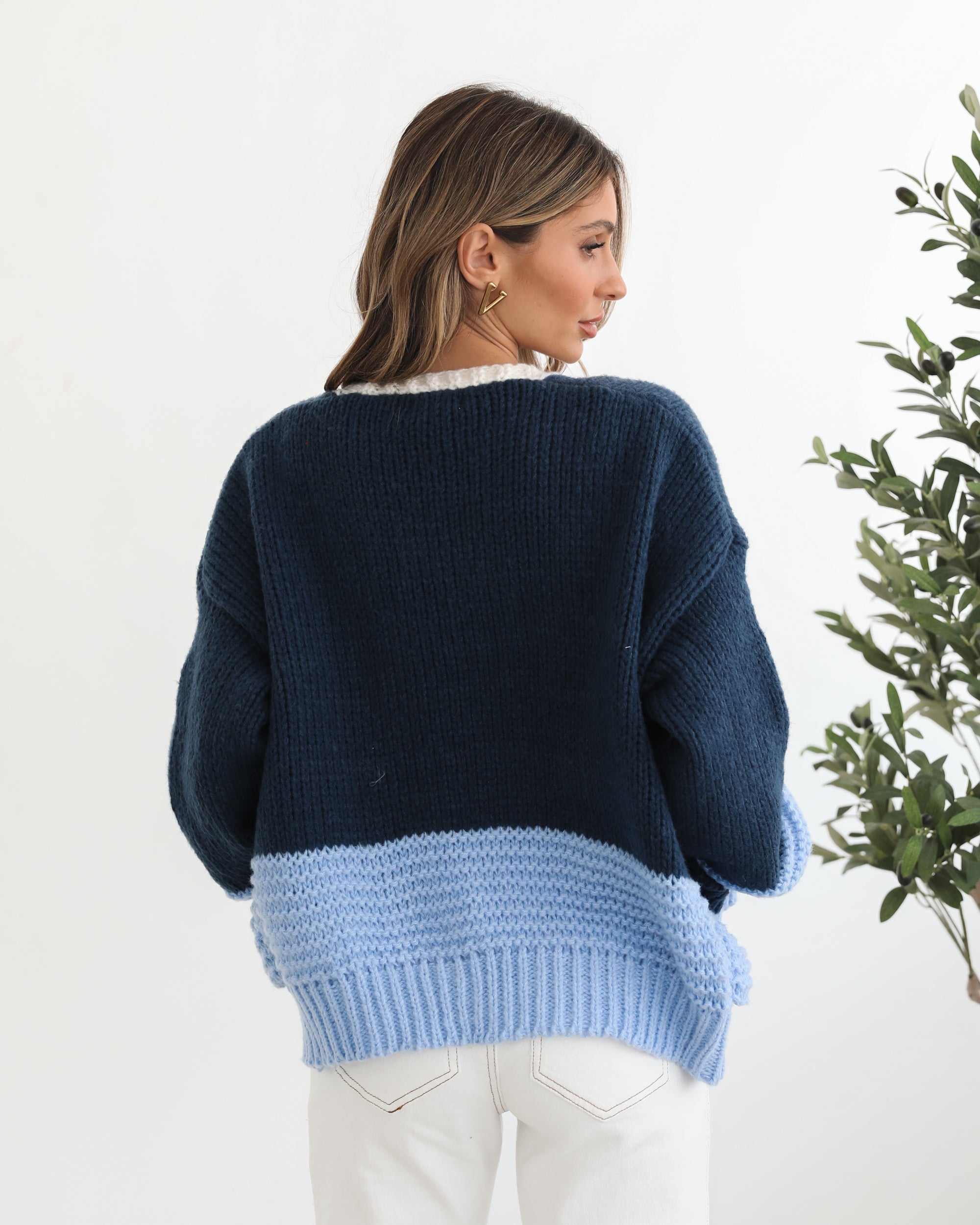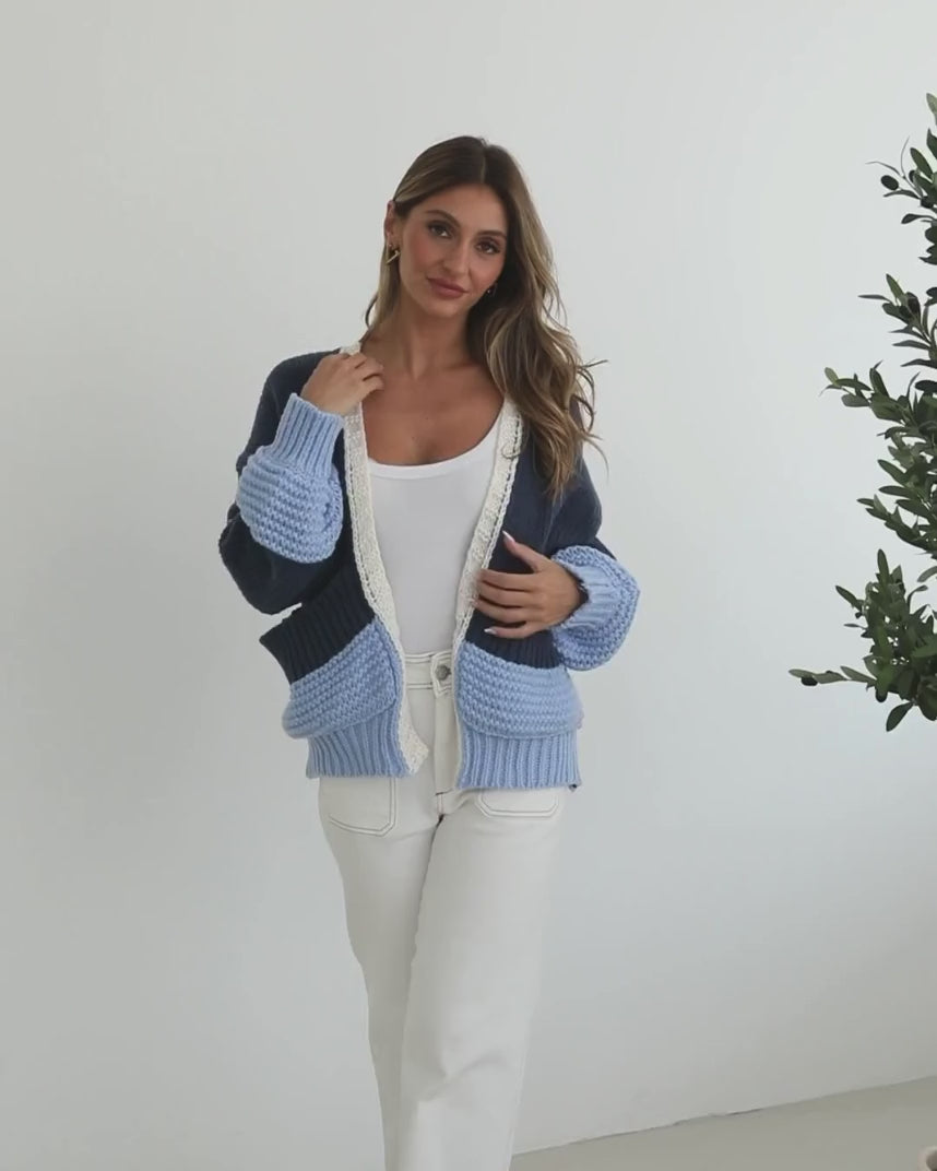 Our Sheona Cardigan comes in blue and cream tones. Surrounding you with all the cosy feels and a pop of fun, this outerwear features an open front, long sleeves with cuffs and semi-relaxed fit. Get ready to take on the world with a sundress and ankle boots!