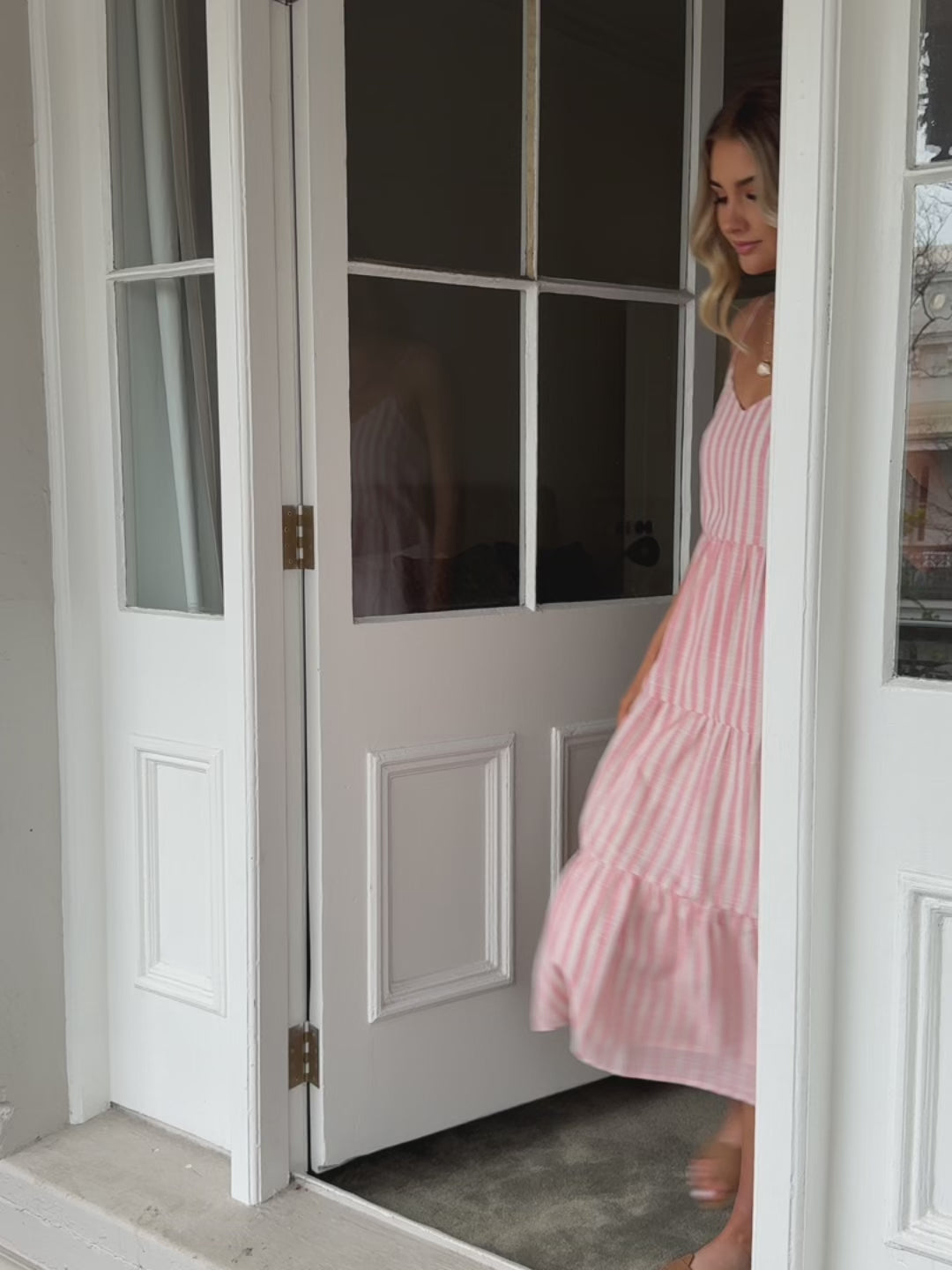 Our Sona Dress comes in a pink base with stripe prints in a relaxed fit. This midi features a V neckline with adjustable spaghetti straps and a comfortable shirred back and flowy tiered skirt. This summer staple is perfect for an effortless and comfortable summer look.