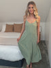 Our Sona Dress comes in a sage base with spot patterns in a relaxed fit. This midi features a V neckline with adjustable spaghetti straps and a comfortable shirred back and flowy tiered skirt. This summer staple is perfect for an effortless and comfortable summer look.